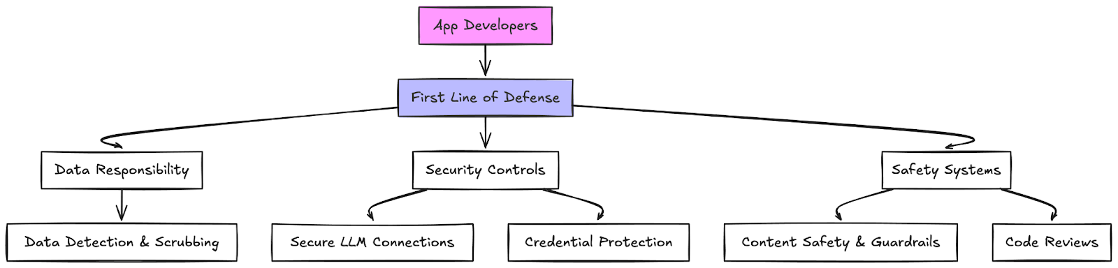 Application developers building apps that leverage LLMs are the first line of defense when establishing control over LLM usage. These developers must be responsible for what data they send or receive in terms of detecting, scrubbing, or outright limiting it. They can adopt content safety or guardrail systems to help with that. They must also be responsible for securely connecting to any LLMs they use. This includes keeping client IDs, secrets, and authorization tokens safe. Code reviews and responsible coding can help here, but this is just one line of defense.