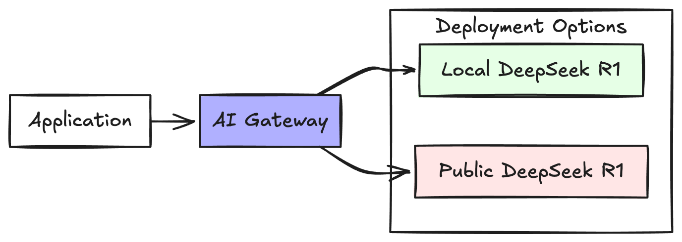 We can use an AI Gateway like kgateway to help implement these intermediary controls for security, prompt guarding, and routing/failover to either the public DeepSeek R1 or to our own self-hosted R1 model. KGateway is a powerful, mature AI gateway built on top of the CNCF Envoy Proxy project.
